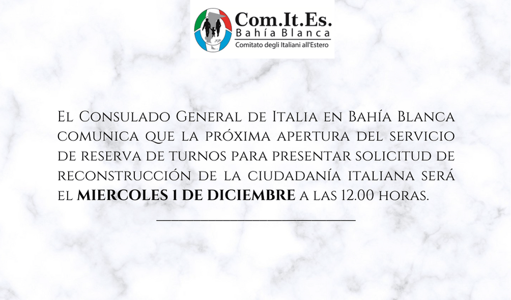 El Consulado General de Italia en Bahía Blanca comunica que la próxima apertura del servicio de reserva de turnos para presentar solicitud de reconstrucción de la ciudadanía italiana será el miércoles 1 de diciembre a las 12.00 hs (hora argentina). Los turnos - que se reservan mediante el sistema Prenot@mi - se asignarán para los […]