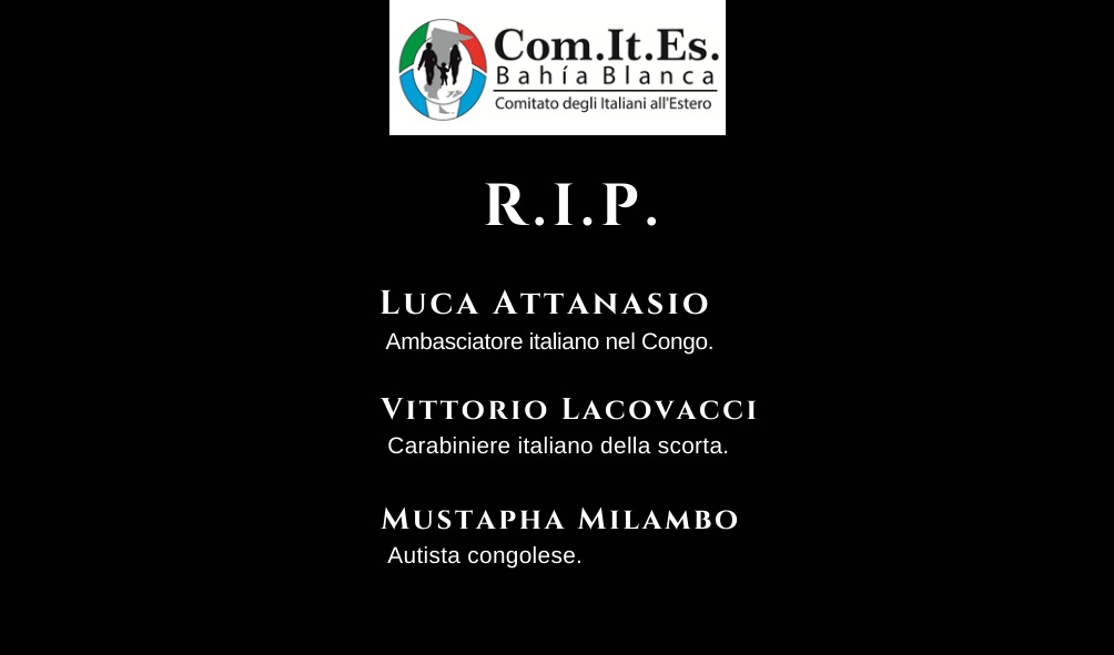 El Com.It.Es. Bahía Blanca, repudia el atentado terrorista en la República Democrática del Congo y lamenta profundamente los asesinatos del Embajador italiano en esa nación africana Dr. Luca Attanasio, el carabiniere Vittorio Lacovacci y el chofer congoleño Mustapha Milambo, en cumplimiento de su deber en el servicio durante el ataque a un convoy del Programa […]